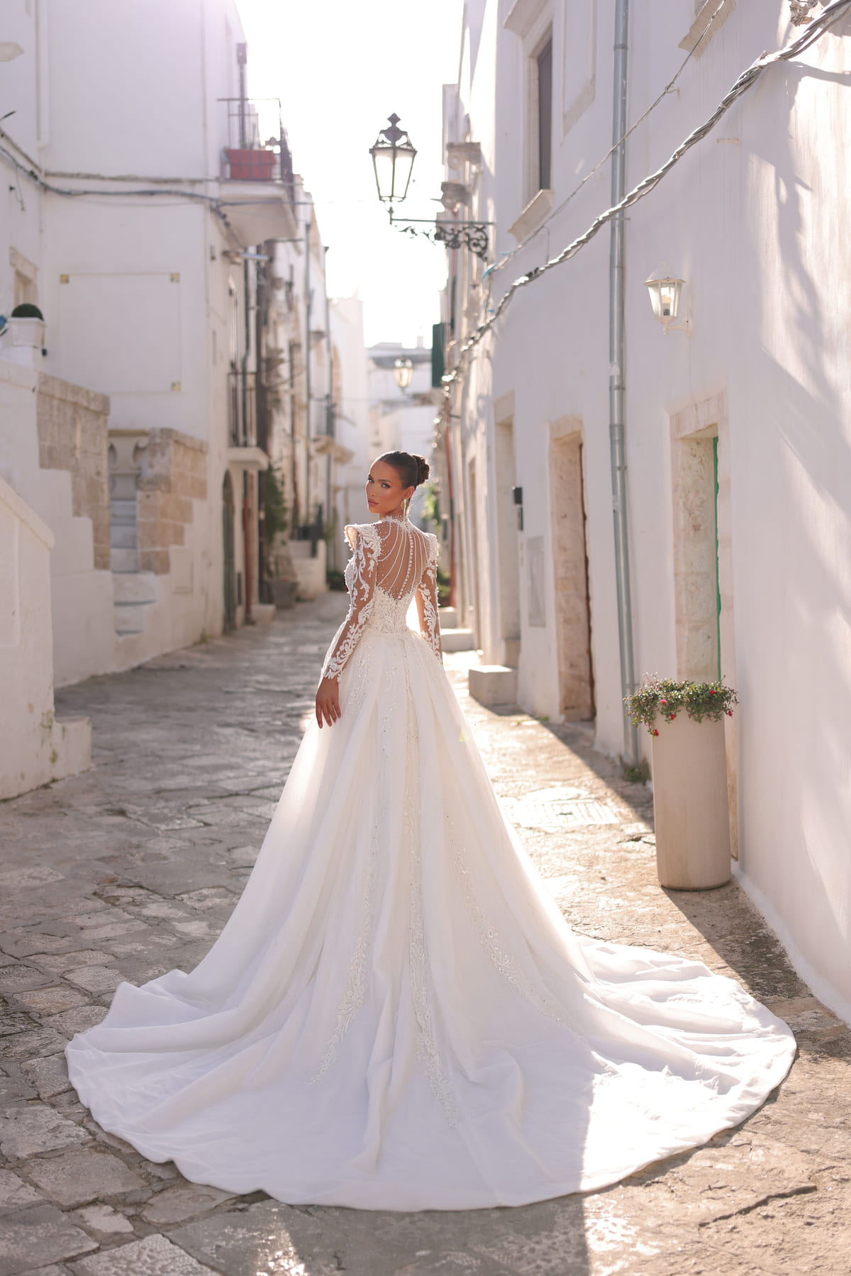 La o ceremonie formală, într-o biserică amplă din București sau într-o sală de tip ballroom din Cluj, o trenă chapel (aprox. 1–1,5 m) sau cathedral (peste 2 m) creează o apariție bine proporționată cu spațiul. Culoarele lungi și scările largi susțin acest efect în fotografii.
